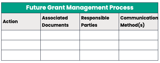 Based on your current process, use a table like the example below to outline what your refined grant management process should look like in the future. Put a star (*) next to items that will be different from your current process.